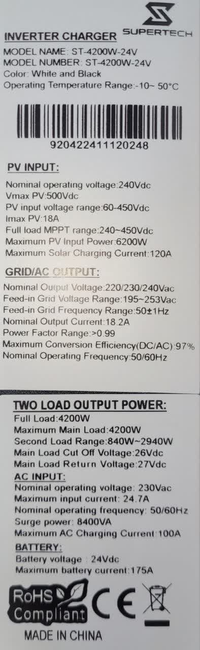 اینورتر شارژر ، سانورتر هیبریدی 4200 وات 24 ولت 120 آمپر mppt برند supertech