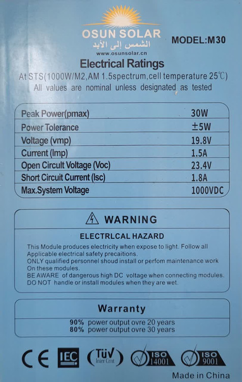 ☀️ پنل خورشیدی OSUN Solar مدل M30 – توان 30 وات